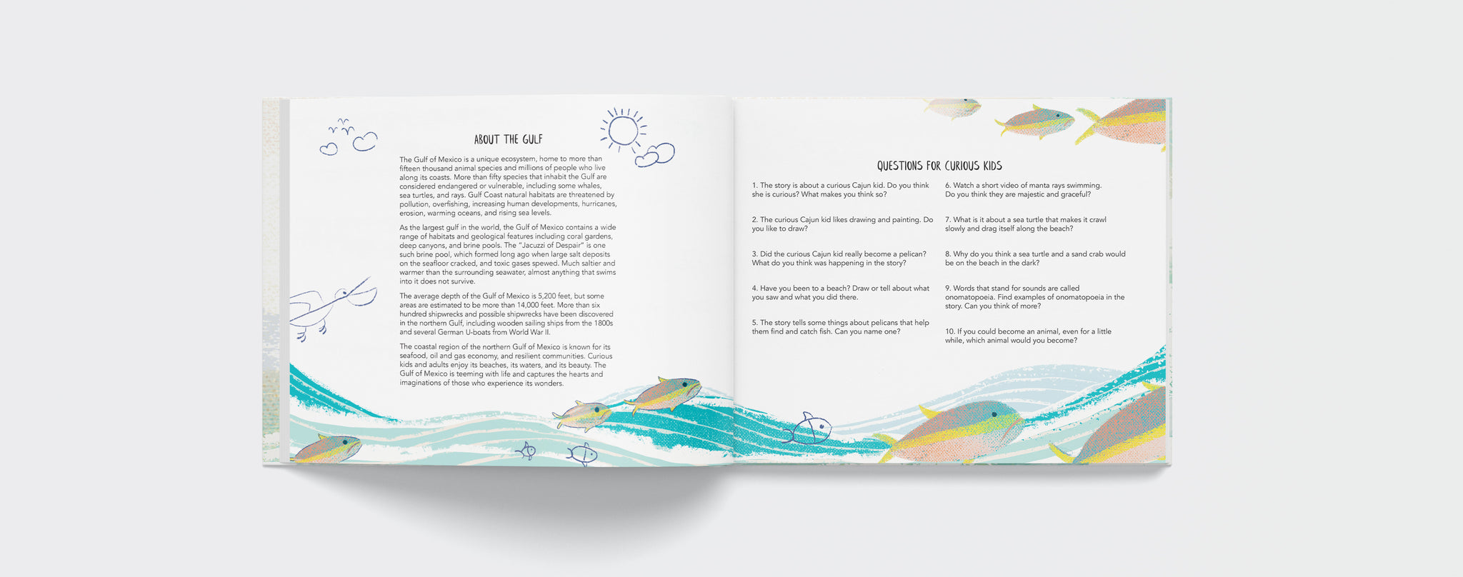Follow along as the curious Cajun kid mysteriously transforms into a series of Gulf Coast creatures, including a shark, a dolphin, a crab, and even a jellyfish! Along the way, each animal reveals something of its habits and habitat. With fun language, charming art, and page-turning onomatopoeia, When I Was a Pelican is a playful and informative exploration of Louisiana’s beloved coastal waters.